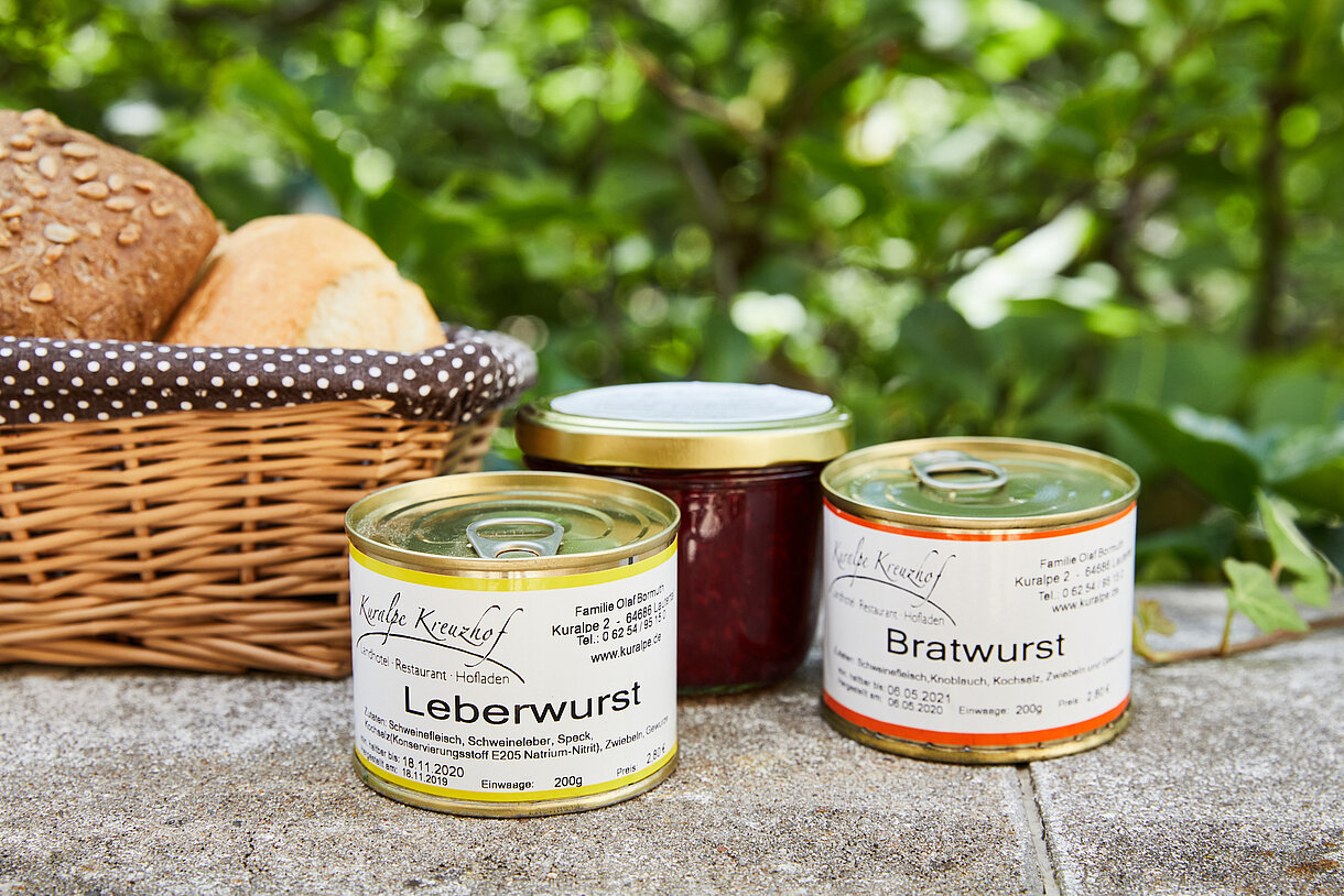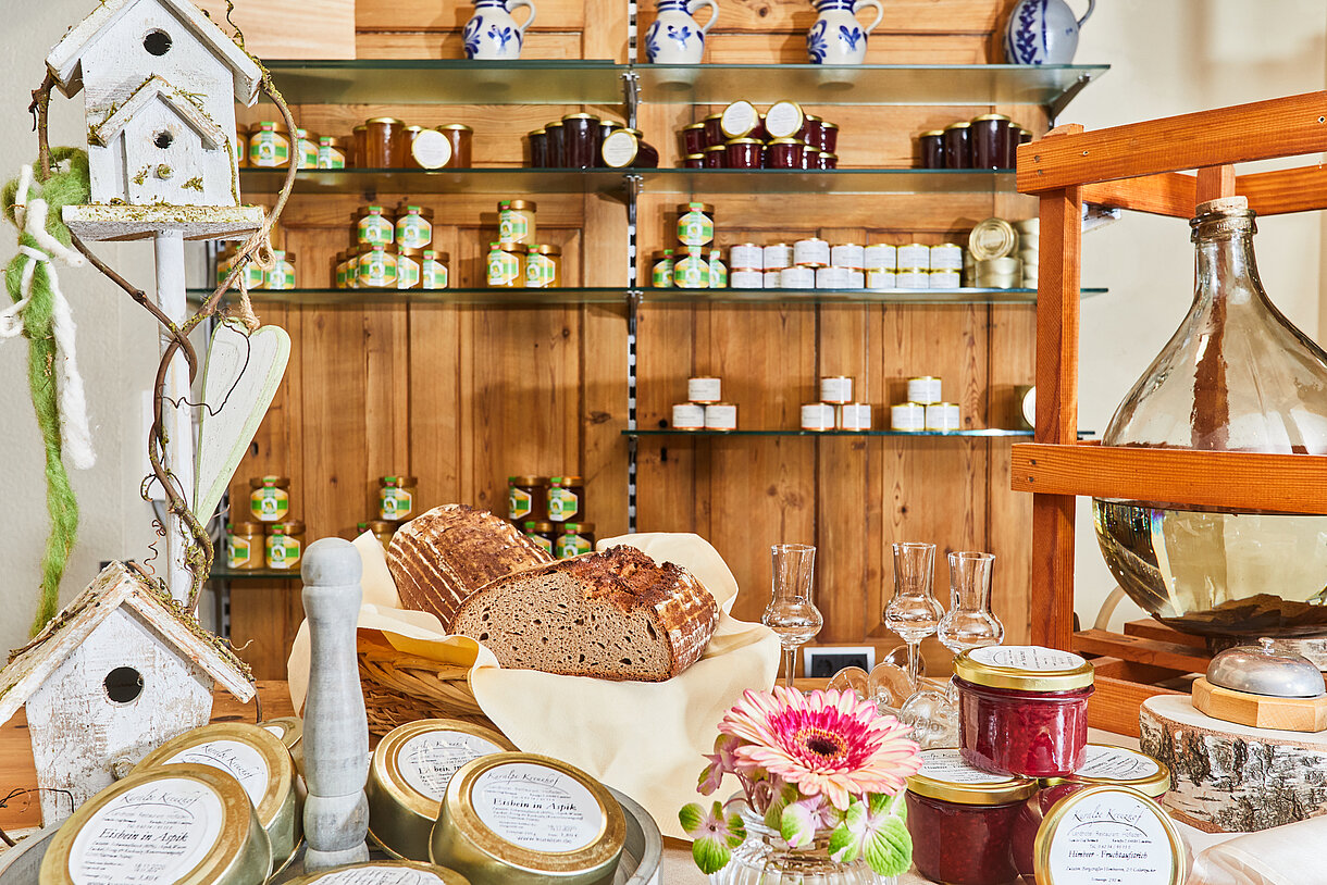 Köstlichkeiten, Natürlichkeiten und Außergewöhnlichkeiten für daheim. Direkt neben der Theke wartet der Hofladen mit jeder Menge „Take away“ auf Sie. Viel Selbstgemachtes ringt um Ihre Aufmerksamkeit - von Leckerbissen aus der eigenen Landwirtschaft bis zu Köstlichkeiten frisch aus der umgebenden Natur. Alles natürlich, regional, oft sogar lokal – echt und authentisch. Wie wär’s mit Erdbeermarmelade oder Himbeerkonfitüre, Holunderblütengelee oder Zwetschgengenuss?
